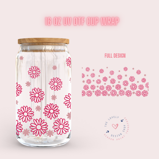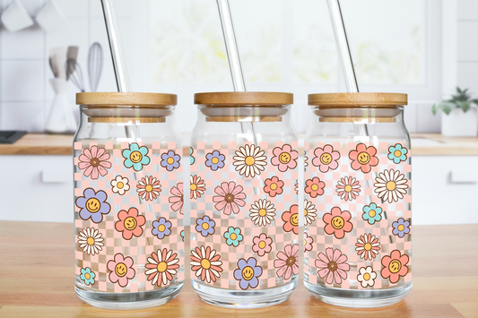 Flower Checkered Pink - UV DTF 16 oz Libbey Cup Wrap (Ready to Ship)