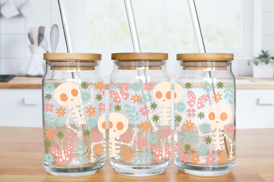 Flower and Butterflies Skellie - UV DTF 16 oz Libbey Cup Wrap (Ready to Ship)